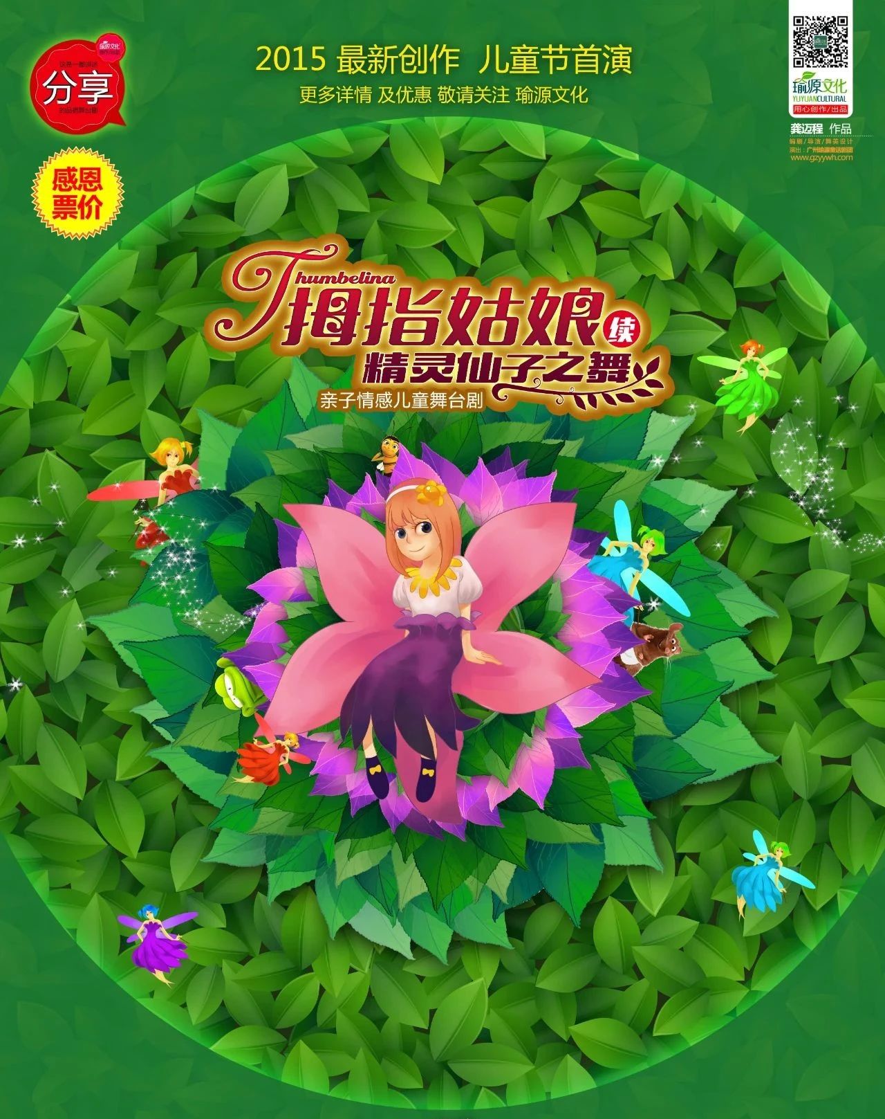 《拇指姑娘-精灵仙子之舞》是一部以“分享”为主题的儿童舞台剧,以童话故事《拇指姑娘》为背景用心创作的引述人性美丑善恶的作品。秉承“用心为孩子,创造引人向善的理念”,利用熟悉的童话故事人物、背景,结合当代价值理念与精神需求,创作的一台给家长带去思考,给孩子带来鼓励的原创舞台剧。