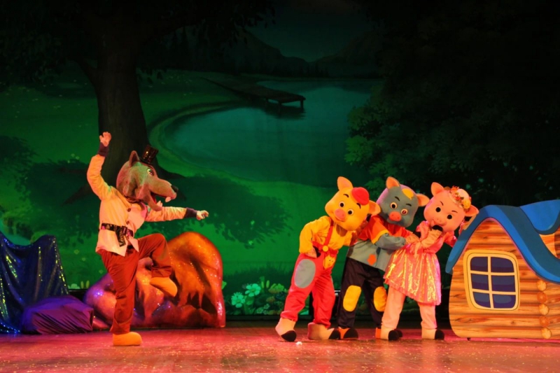✿演出幕数:7幕(①森林里来了破坏王/②猪丽叶稻草房子/③猪古力木头房子/④猪葛亮石头房子/⑤神秘老婆婆的拜访⑥互动搬砖造房子⑦智斗大灰狼)