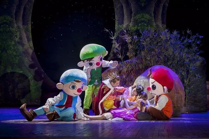 剧目将用灯光营造的意境序幕、金碧辉煌的皇宫、阴森的女巫家、漫天星星的山谷、森林小矮人的树屋、月光下的小树林等7募不同的场景。实实在在的舞美设计塑造出大场面、大气势、大场景的舞台环境,给观众美妙的视听感觉。