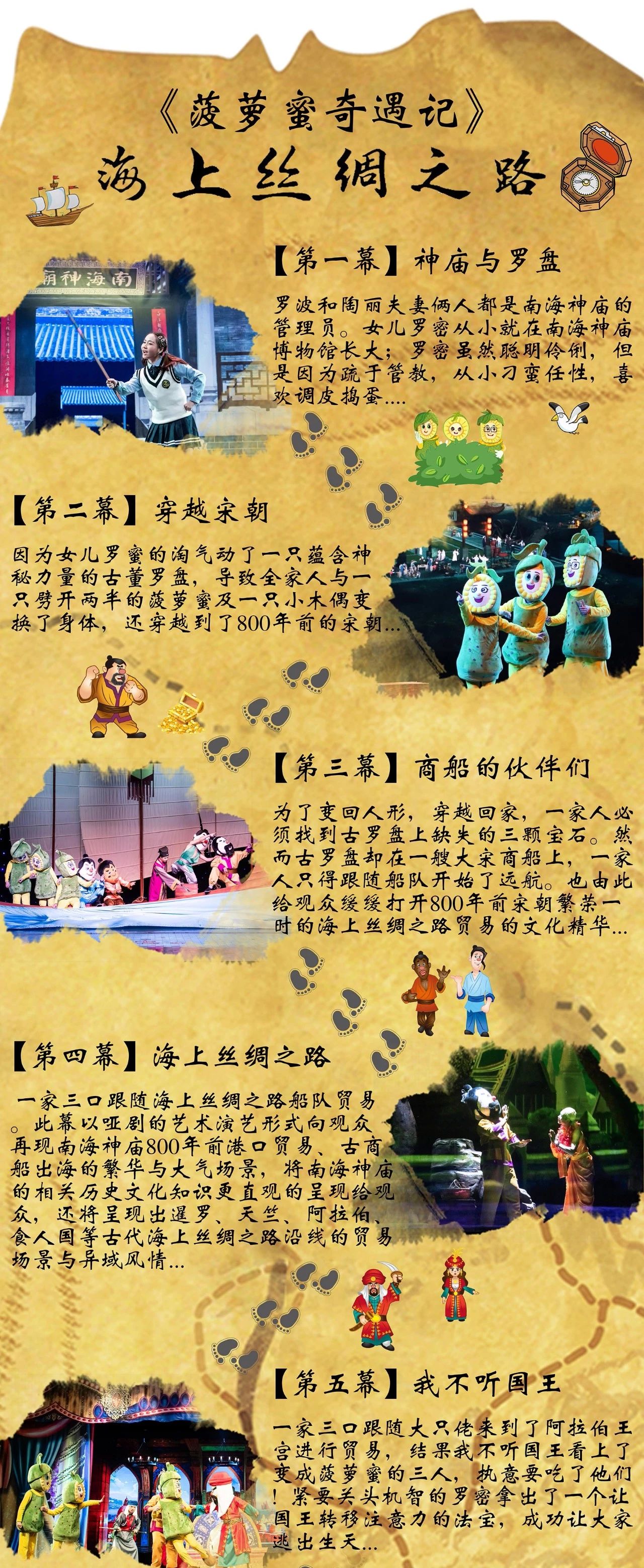 《菠萝蜜奇遇记》从现实与历史、温情与冒险、娱乐与教育三大核心出发,以贴近当代生活的剧情设计,通过艺术的手法,讲述了南海神庙管理员罗波、陶丽及女儿罗密因偶然事件穿越回800多年前的宋朝,变成了“波罗蜜人”开启冒险海丝旅程的故事。以“菠萝蜜人”的视角讲述海丝文化和中国家庭伦理观念,演绎幸福和爱的真谛,呈现引人向善的力量,引发观者思考。