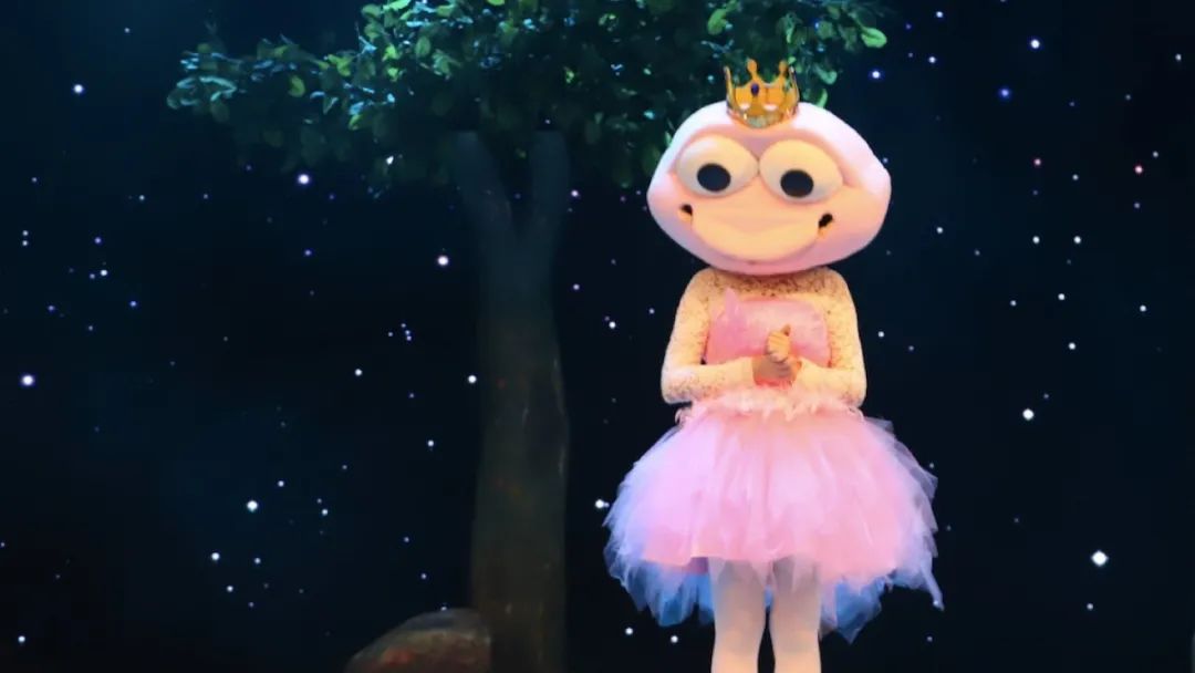 (互动:青蛙王子邀请小朋友一起,举起手中的荧光棒,召唤光明小精灵,为公主的小金球汇聚更多阳光。大朋友小朋友们,进场时,记得领取荧光棒哦!)